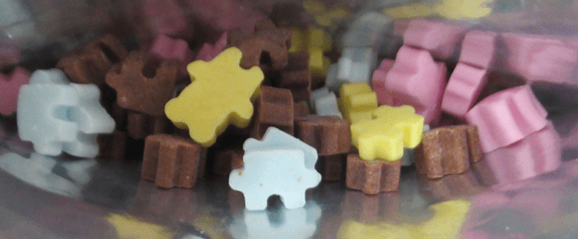 超ミニサイズのパズルのかたちをしたカラフルなお菓子。パズルの色は全4色。